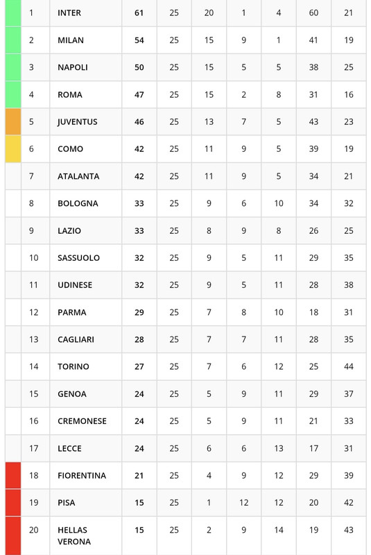 Il Milan, dopo il pari in casa contro il Como nel recupero della 24esima giornata, sale a quota 54 punti, portandosi a +4 sul Napoli ma scivolando anche a -7 dall'Inter capolista. La squadra di Fabregas, invece, sale a quota 42 punti ed in sesta posizione, alla pari dell'Atalanta. Ecco la classifica della Serie A dopo il recupero del 24esimo turno: