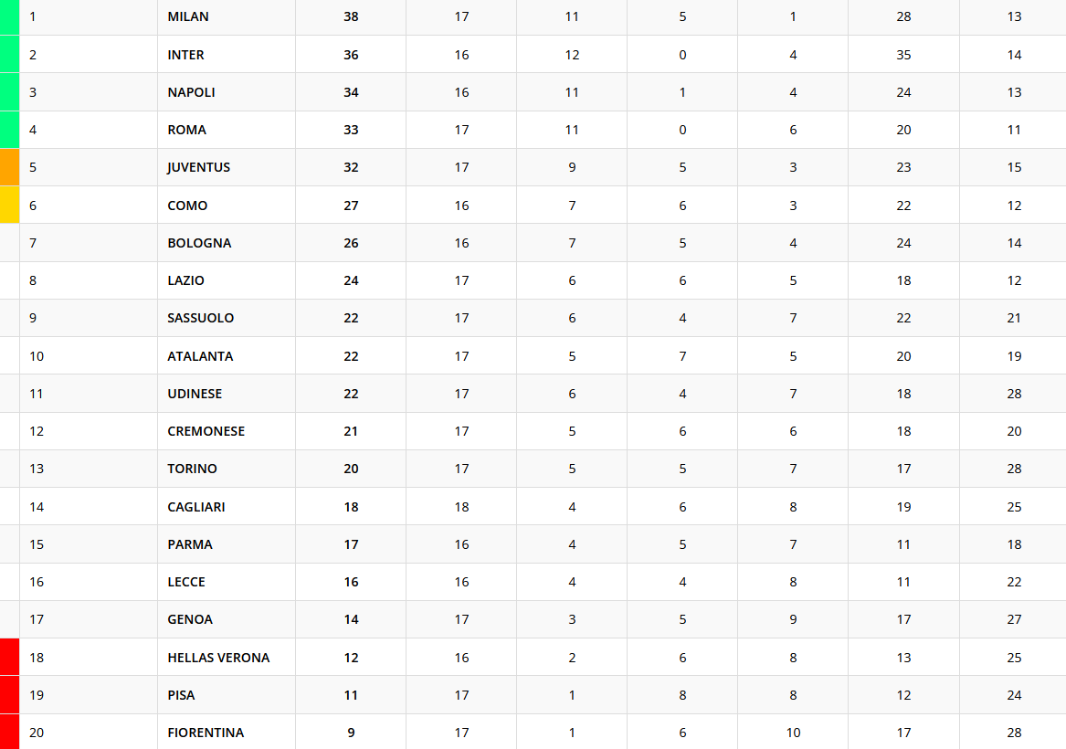 SERIE A - La classifica provvisoria: il Milan vince e sale in vetta