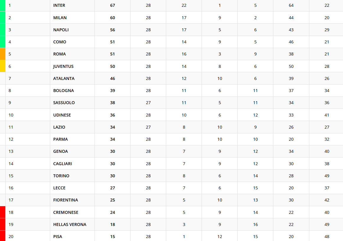 Il Milan si aggiudica il derby contro l'Inter, nel match valido per la 28esima giornata di Serie A. I rossoneri si portano a quota 60 punti, a -7 dall'Inter e a +4 sul Napoli terzo. Ecco la classifica provvisoria della 28esima giornata di Serie A.