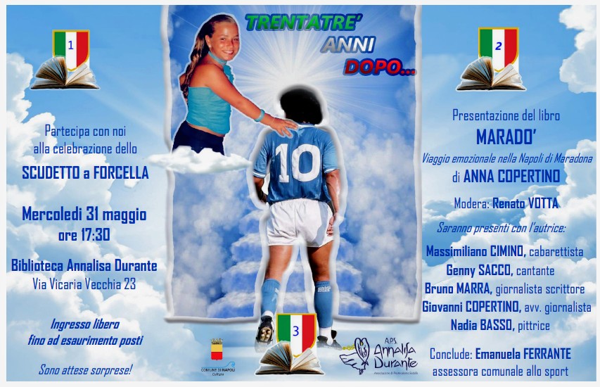 Annalisa Durante, vittima innocente di Forcella, avrebbe oggi 33 anni, come 33 sono gli anni che ci separano dall’ultimo scudetto del Napoli. Nata nel 1990, Annalisa aveva pochi mesi quando il Napoli divenne per la seconda volta campione d’Italia. La giornalista Anna Copertino, autrice del libro “Maradò. Viaggio emozionale nella Napoli di Maradona” – ma anche di “Un giorno per la memoria”, che racconta tra le storie di vittime innocenti della criminalità quella di Annalisa - lo ricorda molto bene ed è per questo che si è dichiarata lieta di dedicare la presentazione del libro “Maradò” ad Annalisa Durante, in occasione dei festeggiamenti del terzo scudetto napoletano nel quartiere di Forcella.
